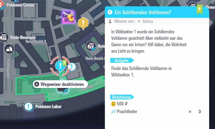 Auf der rechten Seite findest du eine Leiter. Klettere die Leiter nach oben auf das Dach und benutze auf der rechten Seite gleich die nächste Leiter. Oben sollte dann auch schon eine Zwischensequenz starten und das schillernde Voltilamm spawnt vor dir. Jetzt meldet sich Sofina und damit ist die Nebenmission 17 abgeschlossen. Als Belohnung erhältst du 500 Pokédollar und eine Prachtfeder. Das schillernde Voltilamm verschwindet übrigens nichht. Wenn du die schillernde Variante des Taschenmonsters noch nicht gefangen hast, dann kannst du das Pokémon hier fangen.