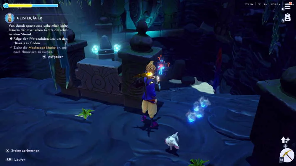 Triff dich zuerst mit dem Ermittlungsteam im Schloss des Biests und höre dir an, was er zu sagen hat. Nach dem Gespräch geht es in die mystische Grotte am schillernden Strand. Dort triffst du auf Von Unruh. Er spürte eine unheimlich kalte Brise in der mystischen Grotte und du sollst den Pfotenabdrücken folgen, um den Hinweis zu finden. Wichtig ist hier auch wieder, dass du die Maskerade-Maske aufgesetzt hast. Sofern noch nicht geschehen, einfach die Garderobe über das Inventar öffnen und die Maske aufsetzen.