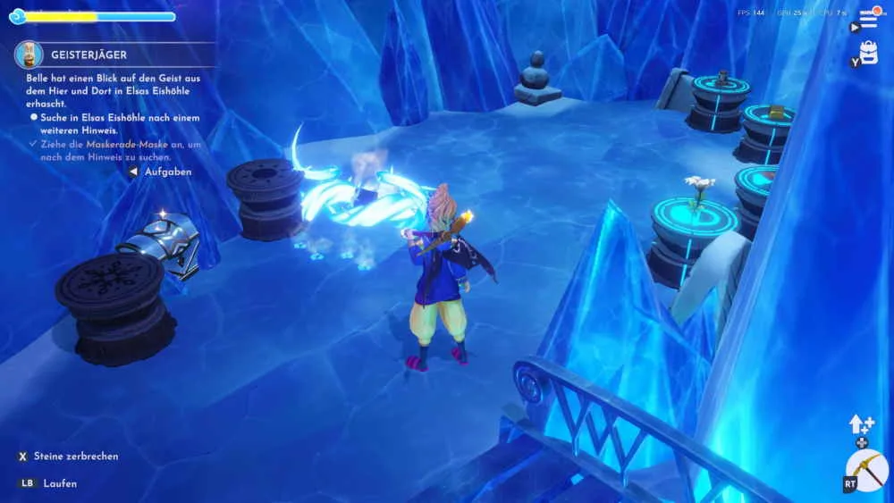 Von den Vitalys-Minen geht es jetzt in den Wald der Tapferkeit und Elsas Eishöhle. In der Eishöhle triffst du auf Belle und folge auch hier wieder den Spuren. Interagiere mit der leuchtenden Nachtdorne und sammle das gefrorene Buch ein.
