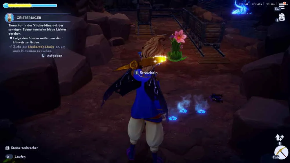 Entferne die leuchtenden Pfotenabdrücken am Boden und ganz unten triffst du wieder eine leuchtende Nachtdorne. Interagiere mit der Nachtdorne und sammle die gefrorene rote Passionslilie ein. Bringe die Blume zu Von Unruh und besuche Tiana und den Vitalys-Minen. Die Der Eingang in die Vitalys-Minen befindet sich auf der sonnigen Ebene hinter dem Wasserfall.