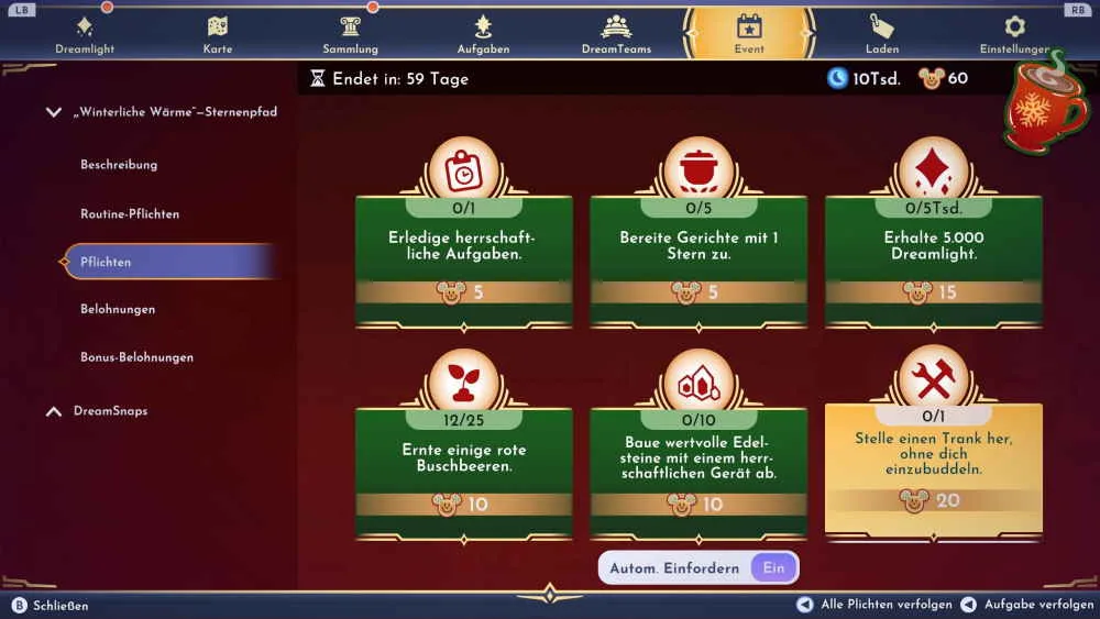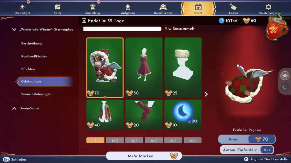 Mit dem Cinderella-Update ist auch der neue Sternenpfad namens „Winterliche Wärme“ in Disney Dreamlight Valley gestartet. Ab heute hast du insgesamt 60 Tage Zeit die Aufgaben zu erledigen und wirst dafür mit kleinen Mickey-Mäusen belohnt. Diese kannst du dann wie bei älteren Sternenpfaden gegen verschiedene Belohnungen eintauschen. Zu den Belohnungen gehören wieder besondere Dekorationen und auch die einen oder anderen kostenlosen Mondsteine.