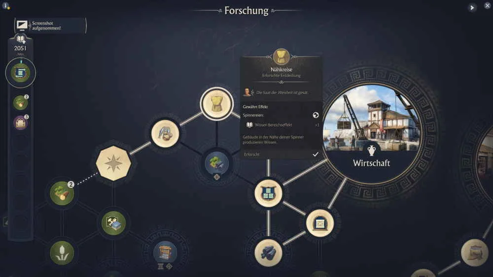 Eine weitere Möglichkeit das Wissen schon früh zu erhöhen, sind einige Freischaltungen im Forschungsbaum. So kannst du zum Beispiel die Entdeckung „Nähkreise“ früh im Spiel unter dem Forschugnsbaum für die Wirtschaft freischalten. Anschließend erhalten Gebäude in der Nähe deiner Spinner einen Wissenspunkt als Bonus dazu. Das hört sich anfangs nicht viel an, da es aber alle Gebäude im Umkreis sind, ist das schon ein netter Bonus. Letzteres funktioniert übrigens nur in Latium uind NICHT in Albion. Mit der Freischaltung der Eques kannst du auch Schrifttafeln freischalten, was wiederum auch einige zusätzliche Wissenspunkte gibt. Gleiches gilt auch für die Lyren über den Lyramacher. Später gibt es dann noch die Minerva-Forschung und andere Entdeckungen, die zusätzlich einen kleinen Buff geben. Gleiches gilt im späteren Spielverlauf für die Spezialisten. Wenn du Minerva als Schutzgöttin auswählst, dann bekommst du auch noch einen weiteren Buff auf Wissen.