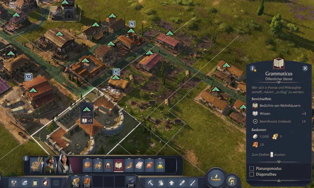 Zum einen bekommst du über mehr Häuser und einem besseren Stadtstufe und zum anderen Gebäudebuffs die benötigten Wissenspunkte. Neben den Gebäuden an sich gibt es auch noch verschiedene Buffs mit denen du mehr Wissen generieren kannst. Da wären zum einen die Gebäude rund um den öffentlichen Dienst wie der Fanum der Schmiede oder der Grammaticus der Plebejer. Mit dem Bau erhöht sich das Wissen der Bewohner im angezeigten Umkreis. Aus diesem Grund ist es wichtig, möglichst viele Gebäude (sowohl Wohngebäude als auch Produktionsgebäude) in die Nähe der genannten Gebäude zu stellen. Du kannst natürlich auch mehrere von dem Fanum bauen.