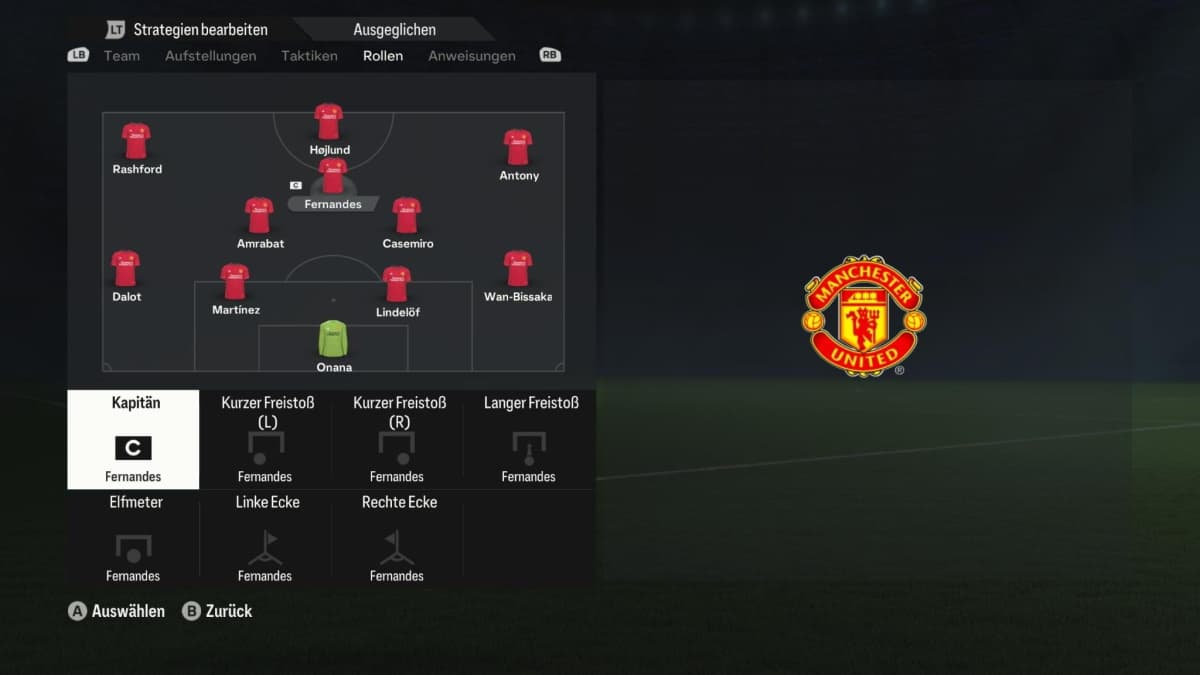 - Unter der „Taktik-Vorlage“ kann man jetzt die Registerkarte für die „Rollen“ öffnen und hier den Kapitän manuell einstellen und verändern.