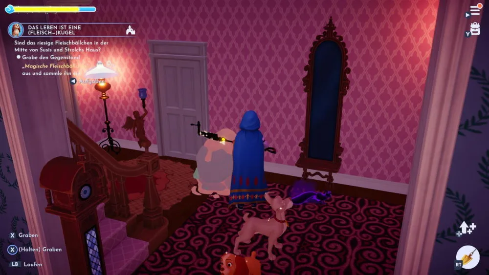 Susi hat im Haus von Ursula weitere Fleischbällchen gerochen und du musst sie wieder mit der Schaufel entfernen. Höre Susi bei ihrem Gespräch mit Ursula zu und mit ihr über deine Funde. Bewege dich jetzt in das Haus von Goofy. Dort nochmal die gleiche Aufgabe wiederholen und die Bällchen mit der Schaufel entfernen. Höre danach Susi im Gespräch mit Goofy zu. Überreiche ihr die Bällchen und zuletzt geht es nochmal in Mickys Haus.