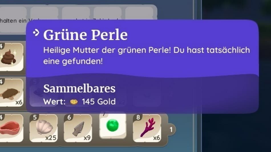 Die grüne Perle erhält man über das Öffnen von geschlossenen Austern. Die Austern findet man wie die Muscheln und Korallen auch an den Stränden in Bahari Bay. Wenn man eine geschlossene Auster aufgehoben hat, dann muss man diese noch über das Inventar öffnen. Die Wahrscheinlich dadurch eine grüne Perle zu erhalten liegt nach bisherigen Informationen bei gerade einmal 5 Prozent. Also am besten gleich mehrere Austern farmen, wenn man die Perle oder die grüne Perle sucht.