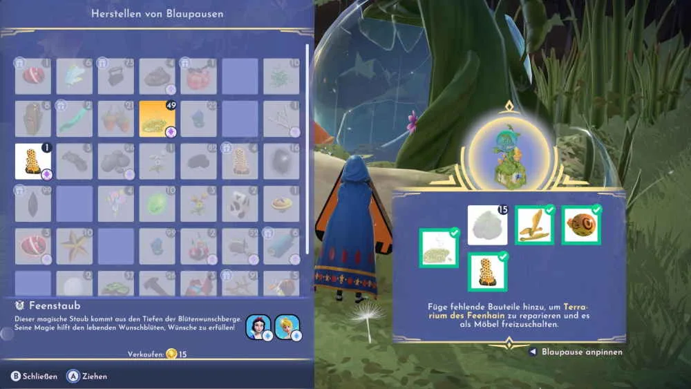 Nach dem Start der unruhige Nachbarn Quest musst du Naseweis zum Terrarium im Feenhain folgen. Das Terrarium befindet sich im südwestlichen Teil des Feen-Hügels und ist auf den ersten Blick nicht mehr ganz vollständig. Sprich mit Feenhain und triff dich danach mit Tigger. Er schickt dich dann auf die Suche nach den Materialien, um das Feendorf-Terrarium mit der Blaupause reparieren zu können. Die folgenden Materialien werden benötigt:
