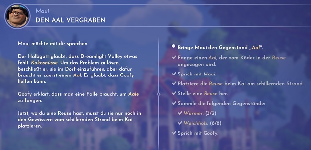 In Disney Dreamlight Valley kann man derzeit 25 verschiedene Fische fangen. Zu der Kategorie „Fische“ gehören unter anderem auch Garnelen, Hummer aber auch Seetang. Der Aal gehört aktuell noch nicht zu den Fischen, die man in den verschiedenen Gebieten fischen kann. Eine Ausnahme gibt es hier aber, denn man kann im Spiel im Rahmen der Quest Den Aal vergraben einen Aal fangen. In der Quest von Maui muss man einen „Aal“ mit Hilfe einer Reuse bzw. Fischfalle und Würmern fangen. Aus dem gefangenen Aal wächst dann eine Kokospalme.