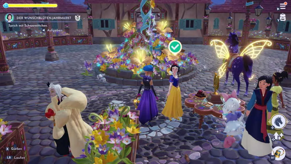 Als Erstes musst du die Einladungen zum Wunschblüten-Jahrmarkt an die entsprechenden Bewohner verteilen. Dazu gehören Tiana, Daisy und Mulan. Die Einladungen erhältst du automatisch zum Start der Quest von Schneewittchen. Überbringe die Einladungne zum Wunschblüten-Jahrmarkt an die drei Juroren und sprich danach wieder mit Schneewittchen.