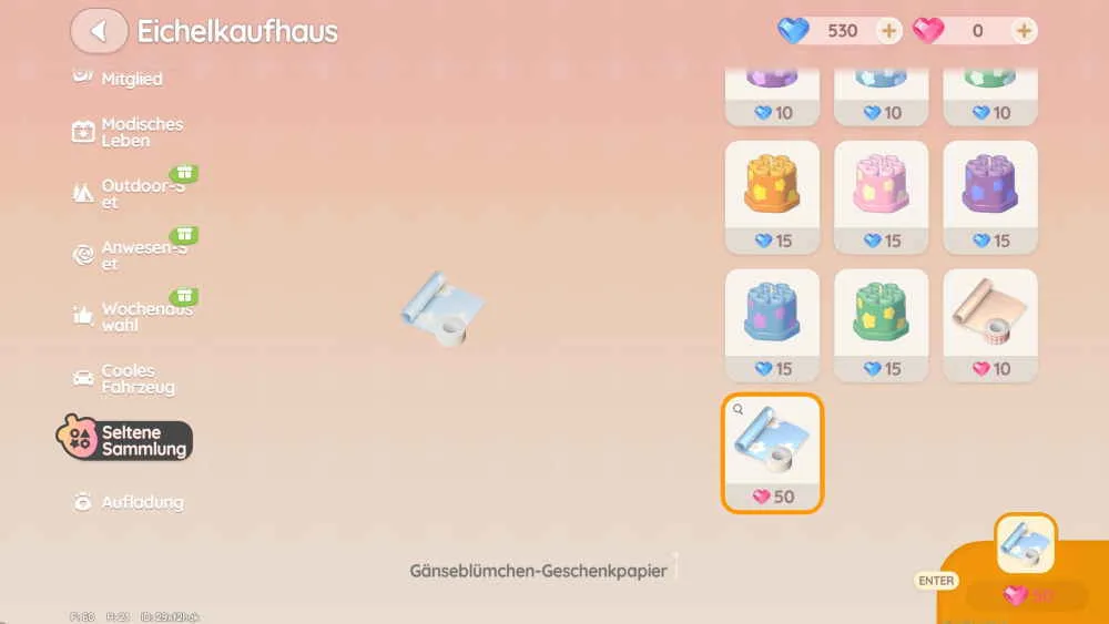 In Heartopia kannst du aktuell nur bestimmte Gegenstände verschenken, die vorher in Geschenkpapier eingepackt wurden. Hier ist der Haken, denn nach bisherigen Informationen ist das Geschenkpapier nur über den Ingame-Shop verfügbar. Klicke oben auf das Warenkorb-Symbol und wechsle im Shop auf die „Seltene Sammlung“. Ganz unten findest du dann Geschenkpapier wie das zuckersüße Geschenkpapier für 10 Herzdiamant oder das Gänseblümchen-Geschenkpapier für 50 Herzdiamant. Für den Kauf benötigst du die Herzdiamanten. Die Herzdiamanten kannst du mit echtem Geld kaufen und ganz selten im Spiel kostenlos bekommen. Mit dem Geschenkpapier kannst du dann verschiedene Gegenstände wie geschriebene Bücher einpacken und als Geschenk an Freunde schicken.