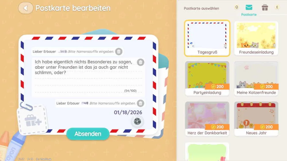 Wenn du einer Freundin oder einem Freund eine Postkarte senden möchtest, dann musst du über die Uhr das Menü öffnen und das Freundebuch öffnen. Nach der Auswahl kannst du dann unten rechts auf den „Postkarte schicken“ Button klicken und eine Nachricht auf die Postkarte schreiben. Auf der rechten Seite kannst du außerdem noch zwischen verschiedenen Postkarten-Designs auswählen und weitere Designs freischalten. Unten links auf der Postkarte erscheint ein Geschenk-Symbol und mit einem Klick darauf erscheint rechts ein „Geschenk auswählen“-Fenster. Bei den meisten Spielern wird das wahrscheinlich leer sein und es stellt sich die Frage: Was kann ich verschenken?