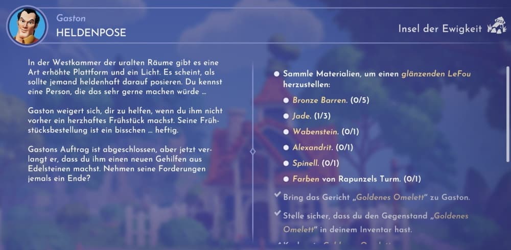 Mit den Zutaten im Inventar geht es dann zum nächsten Herd, an dem du das goldene Omelett zubereiten kannst. Nachdem Gaston das goldene Omelett verspeist hat, sollst du ihm jetzt noch die Materialien für einen glänzenden LeFou besorgen. Zu den Materialien gehören: