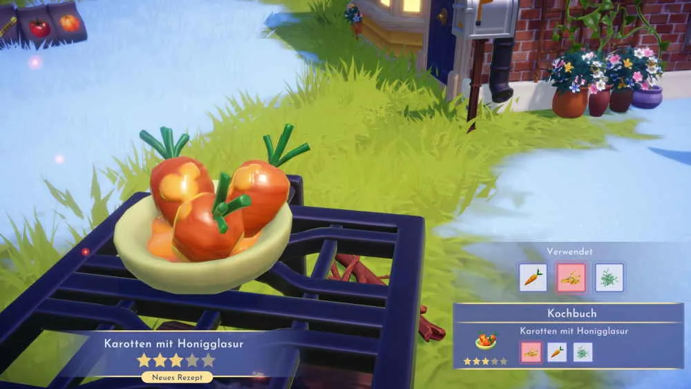 Für die Karotten mit Honigglasur brauchst du drei Zutaten und dazu gehören neben Karotten auch eine Honigkoralle und Dill. Die Honigkoralle ist unter der Kategorie der Fische zu finden und du kamnst sie in den Gebieten des Feenhains aus den weißen Wellen fischen. Zu den Gebieten im Feenhain gehören das Eisbrecher-Ufer, der Feen-Hügel, die Honigfälle und die Hundertmorgenfelder. In den meisten Fällen hatte ich im ersten oder zweiten Versuch eine Honigkoralle am Haken. Der Dill gehört zu den Gewürzen und Kräutern und wächst in den Wunschalpen und Gebieten wie der Wunschblüten-Farm oder dem Wunschweg. Mit den drei Zutaten geht es dann zum nächsten Herd und zusammen mit einem Stück Kohleerz kannst du das 3-Sterne-Gericht Karotten mit Honigglasur zubereiten.