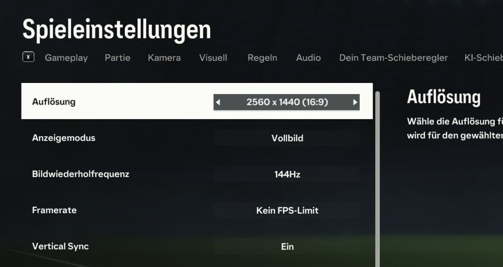 - Auflösung anpassen und Grafik-Einstellungen anpassen. In den Einstellungen unter den Spiel-Einstellungen die „Anzeigekonfiguration“ öffnen. Unter der Anzeigekonfiguration kann man jetzt neben der Auflösung auch andere Grafik-Einstellungen anpassen. Als Erstes sollte man die Auflösung verringern bzw. an die Monitor-Auflösung anpassen. Bei einigen Spielern läuft EA FC 24 den Berichten zufolge wohl standardmäßig in 4K-Auflösung.