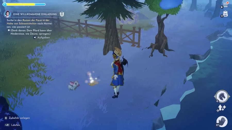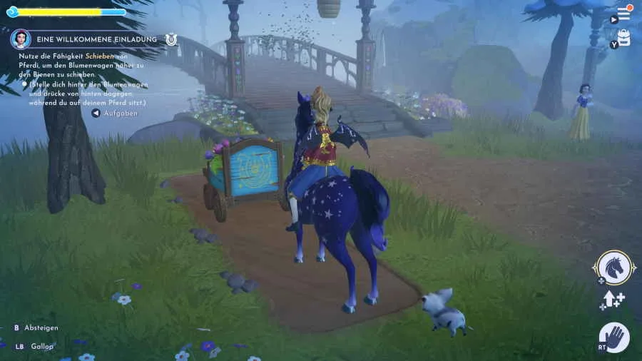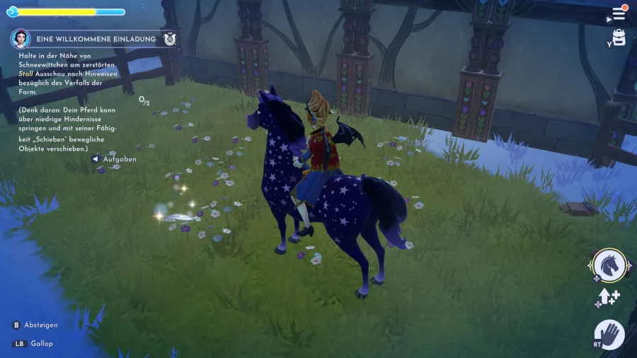 Interagiere mit der Wunschblüte „Schwäche“ und du kannst dir ein Reittier ausschen. Auf dem Pferd kannst du natürlich reiten und dich so schneller fortbewegen. Steige auf das Pferd auf und mache dich mit der Steuerung vertraut. Galoppiere ein paar Meter und springe über die Hindernisse in Form der Heuballen. Kehre mit dem Pferd zu Schneewittchen zurück und schiebe den Blumenwagen näher an die Brücke. Dadurch fliegen die Bienen von der Brücke zum Blumenwagen und du kannst die Brücke pasieren. Sprich wieder mit Schneewittchen und folge ihr zum Wunschbrunnen. Hier sollst du Ausschau nach Hinweisen bezüglich des Verfalls der Farm halten. Ein paar Meter links von Schneewittchen liegt eine Erinnerung auf dem Boden. Interagiere mit der Erinnerung und sprich mit Schneewittchen über deine Entdeckungen.