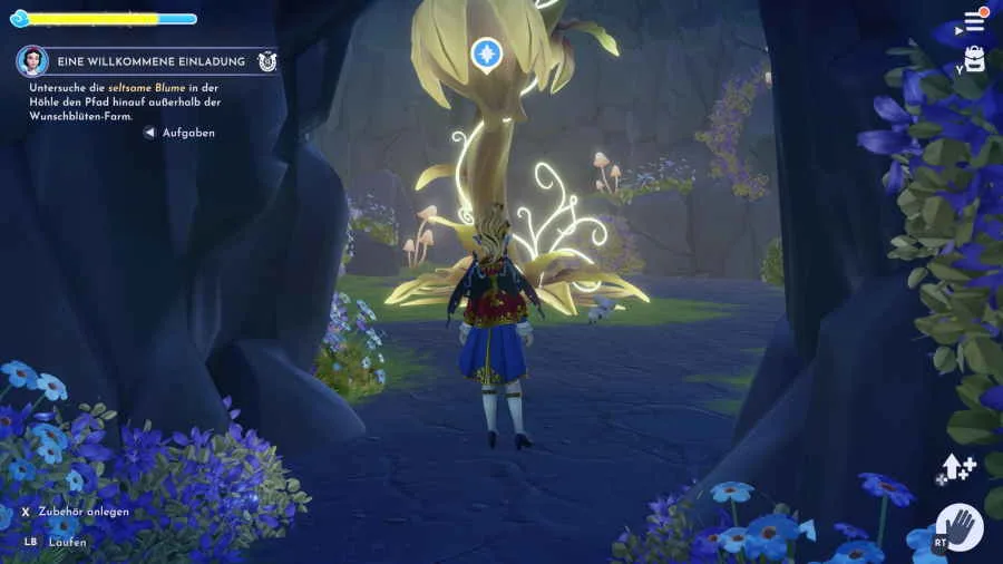 Nach der kurzen Zugfahrt startet eine Zwischensequenz und es geht für dich auf die Suche nach Schneewittchen. Überreiche ihr das Ticket und suche in der Umgebung nach einem Hilfsmittel, mit dem du an dem Bienenschwarm vorbeikommst. Als Hinweis wird eine Höhle in der Nähe angezeigt. Laufe rechts an Schneewittchen vorbei den Berg nach oben und in der Höhle findest du eine seltsame Blume.