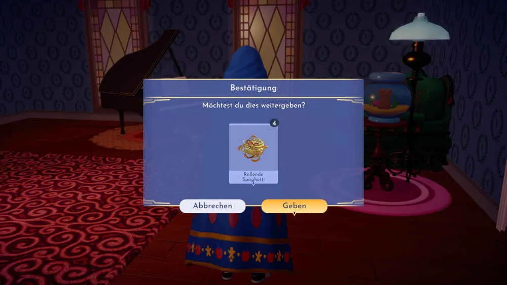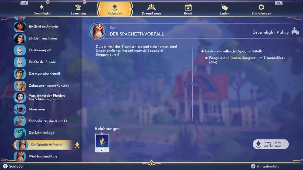 Wenn du das Reich von Susi und Strolch im Traumschloss freigeschaltet und die beiden als neue Bewohnerin und Bewohner im Valley begrüßt hast, dann solltest du nochmal das Traumschloss betreten. Nach der Freischaltung von Daisy startet mit dem Betreten des Traumschlosses eine neue Quest namens „Der Spaghetti-Vorfall“. Im Traumschloss fliegen ein paar Spaghetti-Steppenläufer herum und deine Aufgabe ist es, die rollenden Spaghetti einzufangen.