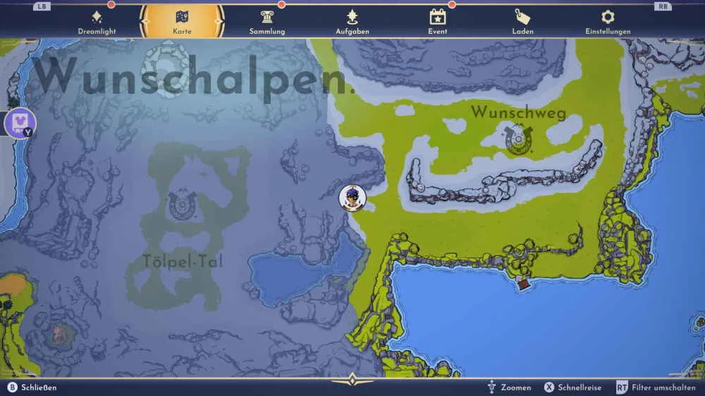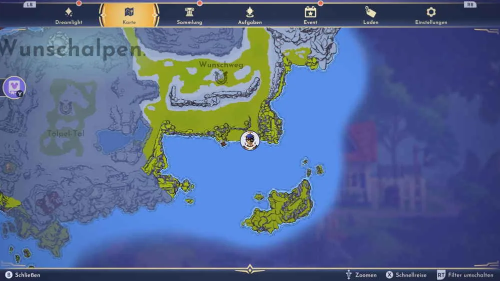 Das dritte Rad kannst du im südlichen Teil des Wunschweges aus dem Wasser fischen. Halte auf dem Wasser Ausschau nach einem orangen Kreis und wirf dort deine Angel aus.