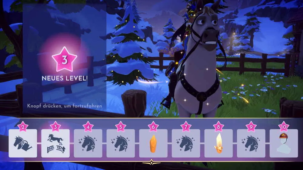 Sprich zuerst mit Schneewittchen, wenn du bereit bist, den nächsten Teil deines Abenetuers im Schimmergrund zu beginnen. Sie gibt dir dann die Aufgabe das Freundschaftslevel von Maximus auf Stufe 3 zu erhöhen. Das ist notwendig, damit du in den Schimmergrund springen kannst. Die Pferde wie Maximus kannst du durch tägliches streicheln, bürsten und füttern leveln. Beim Füttern ist es wichtig darauf zu achten, dass du sie mit ihren Lieblingsdingen des Tages fütterst. Außerdem kannst du einfach mit Maximus herumreiten, über Hindernisse springen und andere Aktivitäten im Tal abschließen. Alles bringt ein paar Erfahrungspunkte und du hast das Pferd innerhalb kurzer Zeit auf Stufe 3 gelevelt.