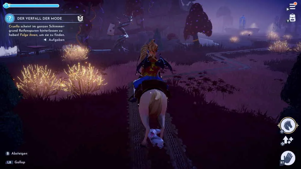 Sobald du das 3. Freundschaftslevel errreicht hast, kannst du mit Maximus zu Schneewittchen reiten und ihr zur Brücke folgen. Springe mit der neuen Fähigkeit von Maximus über die Brücke und du landest im Schimmergrund. Im Schimmergrund hat Cruella ihre Reifenspuren hinterlassen.