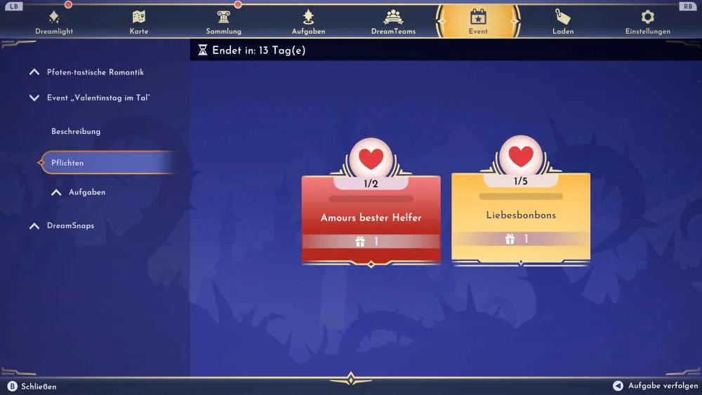 Pro Tag kannst du nur eine der Aufgaben machen. Du brauchst also im besten Fall fünf Tage, um die Liebesbonbon Pflicht abzuschließen. Als Belohnung für die Pflicht erhältst du dann Rote Valentinstags-Blütenblätter.