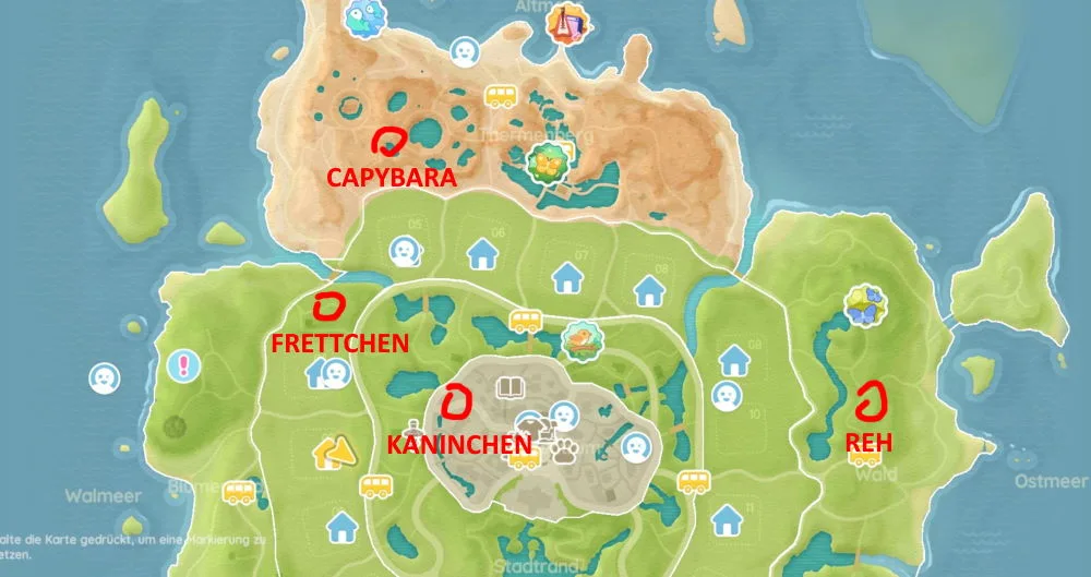Wie oben schon erwähnt sind die Futtertröge der Tiere über die gesamte Insel verteilt. In den folgenden Kartenausschnitten habe ich die Fundorte kurz markiert. Ganz im Norden rund um den Thermenbergsee findest du die Capybara und dann geht es im Süden weiter mit den Frettchen und den Rehen. Sowohl die Vorlieben, was das Essen angeht, als auch die aktuelle Vertrautheit wird dir im Tiermenü angezeigt. Öffne dazu das Swatchwatch-Menü und klicke auf den „Tier-Menü“-Punkt mit dem Pfoten-Symbol.