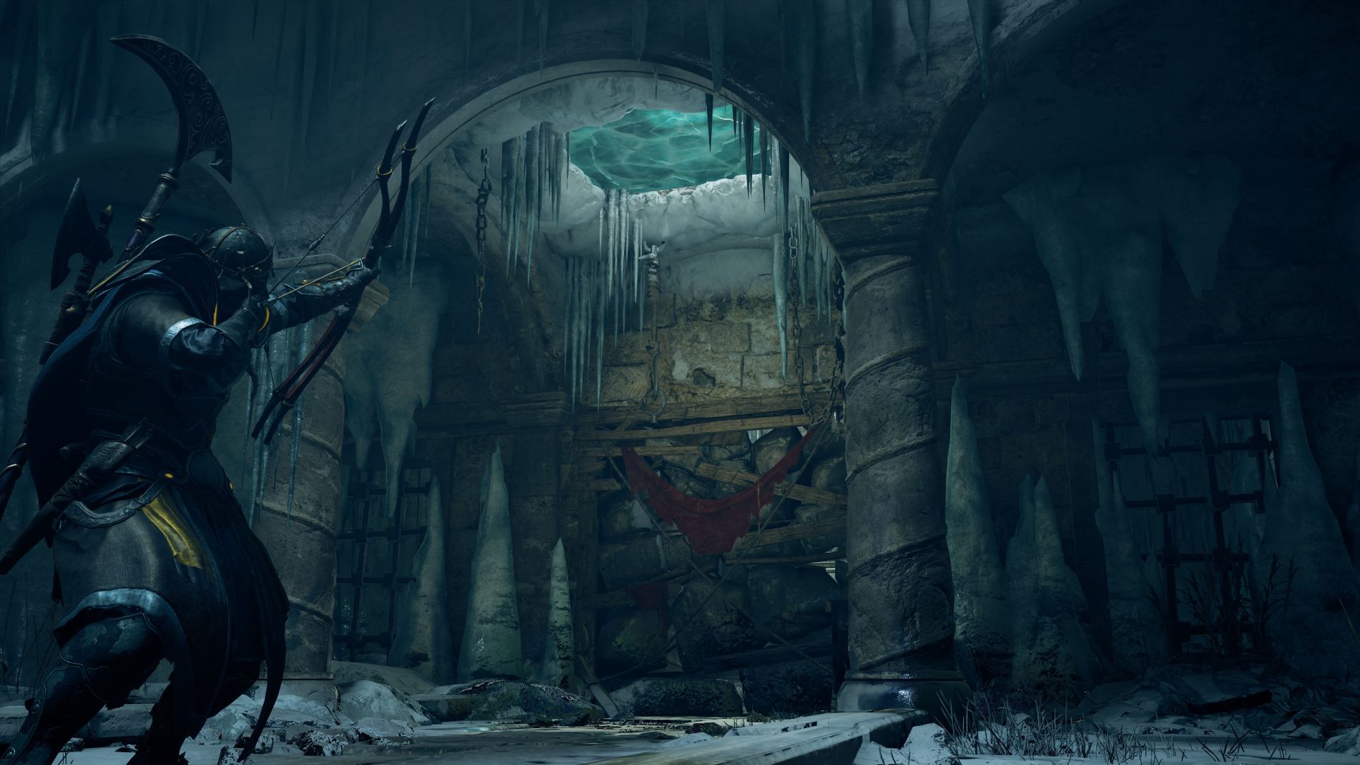 Habt ihr die Rätsel gelöst, öffnet sich das Tor zum Grab. Sprecht mit der Erscheinung und plündert die Truhe für den Heldentod-Helm. Auf dem Weg nach draußen nutzt ihr eine Seilrutsche. In der Schlucht darunter ist ein gigantischer Mammutschädel. Schießt einen Pfeil in die gegenüberliegende Eiswand und holt euch das Artefakt von Venutius’ Grab.