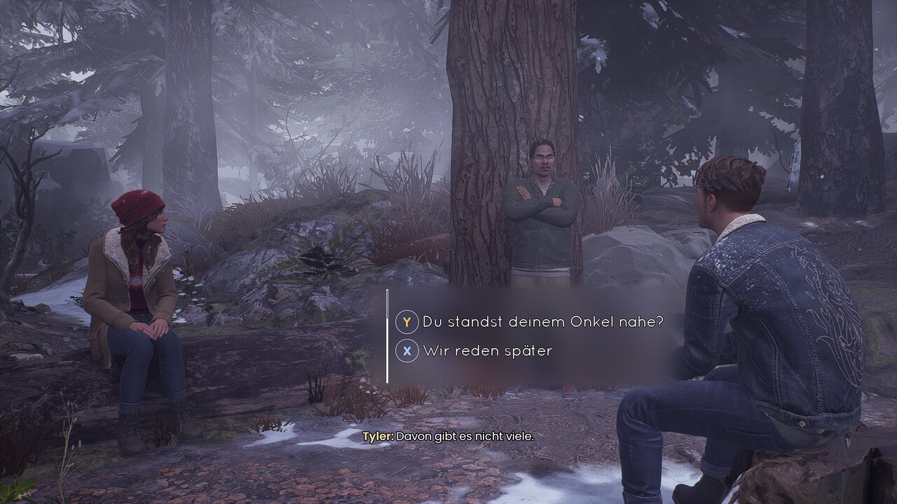 Im nachfolgenden Dialog habt ihr die Wahl auf Tylers Launen einzugehen, ihn damit zu konfrontieren oder das Gespräch auf die Schönheit der Natur zu lenken.