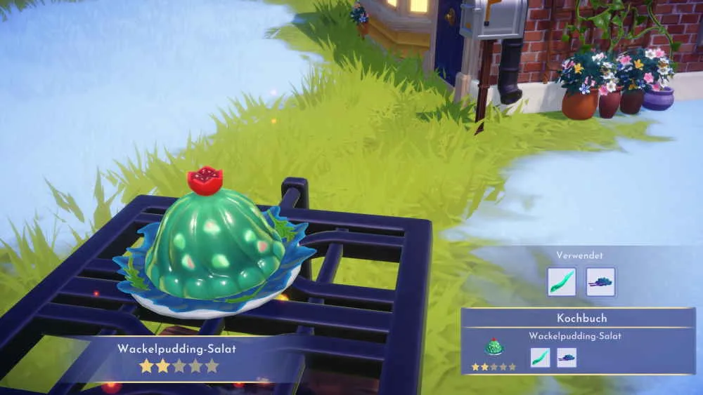 Mit dem Start der Quest erhältst du das Rezept von dem Wackelpudding-Salat. Öffne dein Inventar und erlerne das Rezept. Es handelt sich dabei um eine der insgesamt 20 neuen Hauptspeisen auf der neuen Insel Blütenwunschberge und du musst jetzt die Zutaten dafür besorgen. Zum einen benötigst du den roten Krauser und zum anderen benötigst du einen geleeartigen Fisch. Die Samen für den roten Krauser kannst du bei Goofy in seinem mobilen Verkaufsstand kaufen.