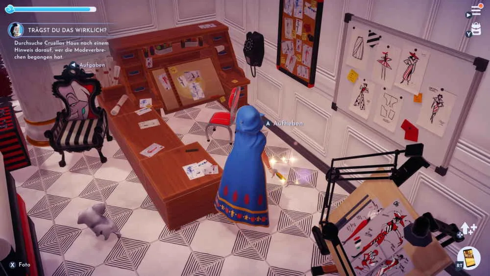 Durchsuche Cruellas Haus nach einem Hinweis darauf, wer die Modeverbrechen begangen hat. Der gesuchte Hinweis liegt auf der linken Seite hinter dem Tisch. Zeig Cruella den Angelköder und sprich mit Vaiana, Donald Duck und Kristoff über deine Entdeckungen.