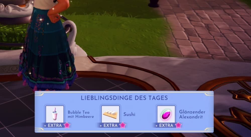 Die Lieblingsgeschenke von der Lieblings-Madrigal kann sich wie gewohnt anzeigen lassen, in dem man sie anspricht und „Ich habe etwas für dich“ auswählt. Die Lieblingsgeschenke in Form von den „Lieblingsdingen des Tages“ ändern sich regelmäßig. Zum aktuellen Zeitpunkt wünsch sich Mirabel die folgenden drei Gegenstände:
