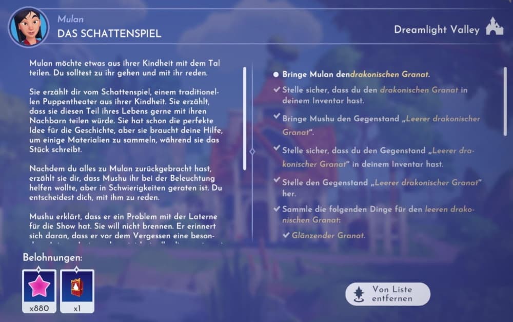 Nach der „Das Tagesprogramm“ Quest kannst du dir bei Mulan mit Freundschaftslevel 4 die nächste Quest abholen und die heißt „Das Schattenspiel„. In der Quest musst du Mulan helfen ein Schattentheater aufzubauen. Für den Bau des Theaters sind einige Materialien erforderlich und dazu gehören ein paar Teile zum Basteln, Seile und Holz sowie einen besonderen drakonischen Granat von Mushu.