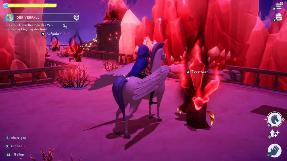 Nachdem du die Quest in der dritten Kristallhöhle abgeschlossen hast, startet automatisch die Naseweis Quest namens „Der Verfall“. Im Rahmen der Quest musst du erst einmal das Level von Pegasus auf 5 erhöhen. Danach kommst du zusammen mit Pegasus auf eine mysteriöse Kristallinsel und musst dort paar Kristalle zerstören.
