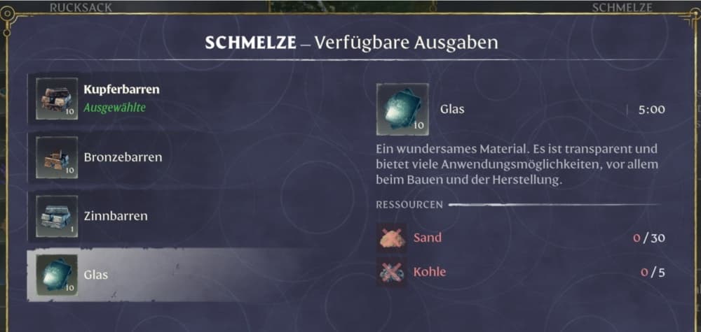 Nachdem man den Schmelztiegel aus der Mine geholt hat, kann man damit zu Oswald Anders zurückkehren und die Schmelze aus dem 1x Schmelztiegel und 50x gebrannten Ziegeln herstellen. An der Schmelze kann man im Anschluss verschiedene neue Materialien herstellen und dazu gehört neben den Zinnbarren, Kupferbarren und Bronzebarren auch das Glas.