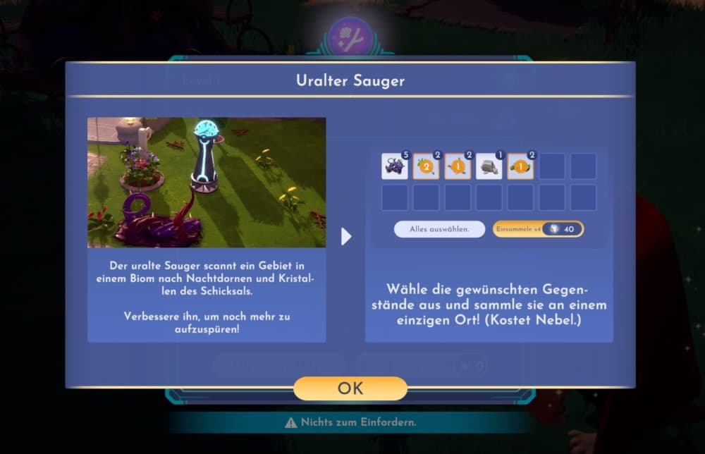 Nachdem man den uralten Sauger an dem Tisch der Zeit gebaut hat, kann man das Gerät über das „Möbel“-Menü in der Spielwelt aufstellen. Anfangs kann der uralte Sauger ein Gebiet in einem Biom automatisch nach Nachtdornen und Kristallen des Schicksals absuchen. Mit den verbesserten Versionen kann man den uralten Sauger auch zum Materialien sammeln verwenden und beispielsweise Holz farmen. Das neue Werkzeug hat aber einen kleinen Nachteil, denn auch wenn die Materialien automatisch eingesammelt werden, muss man Materialien „einfordern“ und das kostet Nebel.