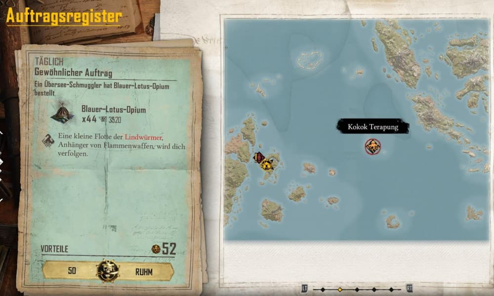 Die Ruhm-Belohnung der Aufträge ist hier aber gar nicht so interessant, sondern die Gegner, von denen man während der Lieferung verfolgt wird. In der Auftragsbeschreibung heißt es „Eine kleine Flotte der Lindwürmer/Basstölpel/Aale/Orcas wird dich verfolgen)“. Statt die Lieferungen jetzt direkt bei dem Übersee-Schmuggler des Ruders abzugeben, sollte man einfach mit dem Weißen-Schädel-Rum oder auch dem Blauen-Lotus-Opium auf dem Meer herumschippern und Ausschau nach den Abtrünnigen und Flotten der oben genannten Gegner halten. Wenn man ein normales Schiff in Skull and Bones versenkt, dann bekommt man neben den Materialien auch 50 Ruhm. Wenn man hingegen die Abtrünnigen-Schiffe bei einer der Lieferungen versenkt, dann bekommt man das Dreifache und zwar 150 Ruhm.