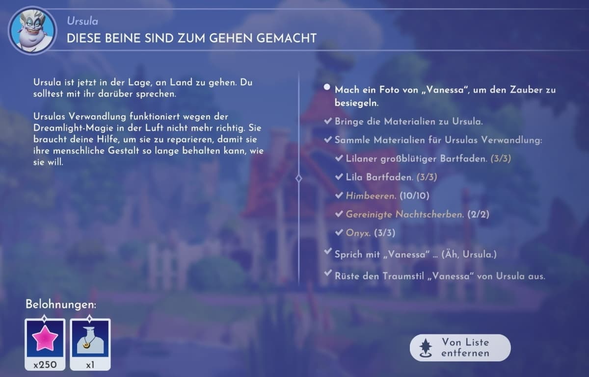 Die gesammelten Materialien muss man jetzt bei Ursula abgeben und mit ihr ein Foto machen. Wichtig ist, man muss Ursula den Traumstil von Vanessa ausrüsten und dann ein Foto machen (sofern nicht bereits geschehen). Zu guter Letzt geht es dann im Rahmen der Quest nochmal in Remys Restaurant, wo man ihr ein 3-Sterne-Gericht zubereiten muss. Nach dem Essen geht es dann nochmal zu Dagobert, wo man drei elegante Möbelstück kaufen und danach aufstellen muss.